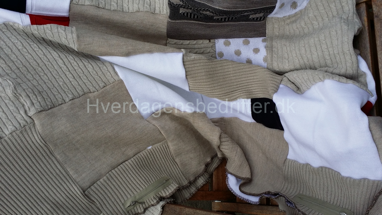 Der florerer mange opskrifter på internettet om hvordan man skal gøre men de fleste kræver uldtrøjer, som skal filtes. Jeg bryder mig ikke om at filte og jeg havde mange strikketrøjer som ikke kan filtes. Desuden ville jeg gerne have en let tv-tæppe som vi kunne bruge en sen sommeraften på sofaen. Og den fik jeg!
