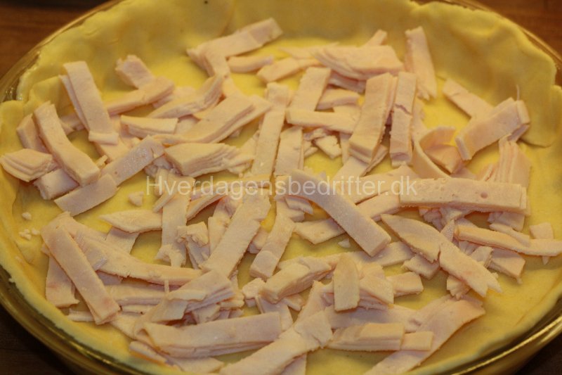 - Fordel skinkestrimler og grøntsager på dejen.